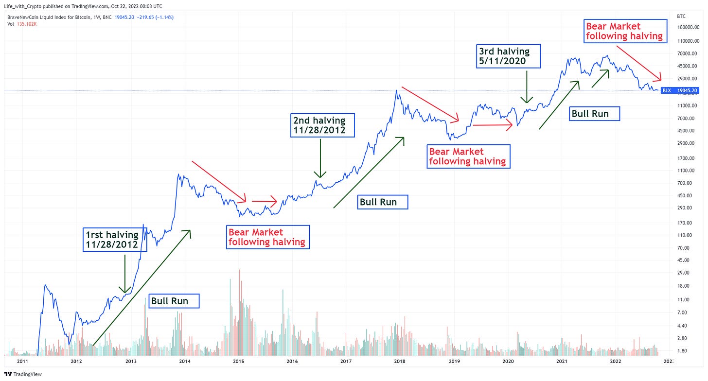 Take a look at the bitcoin minting schedule. Note the amount of BTC minted every four years is cut in half until they’ve all been mined.